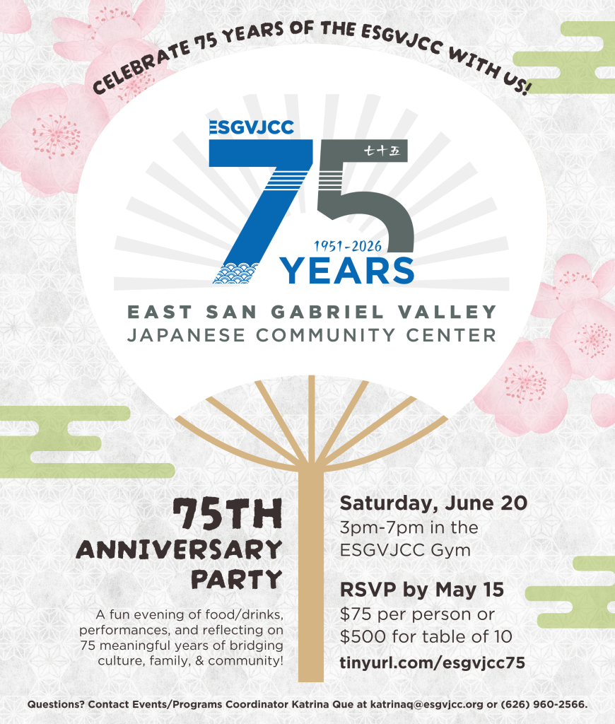 Please email Events/Programs Coordinator Kazumi Boone at kazumib@esgvjcc.org or call the ESGVJCC Office at (626) 960-2566.