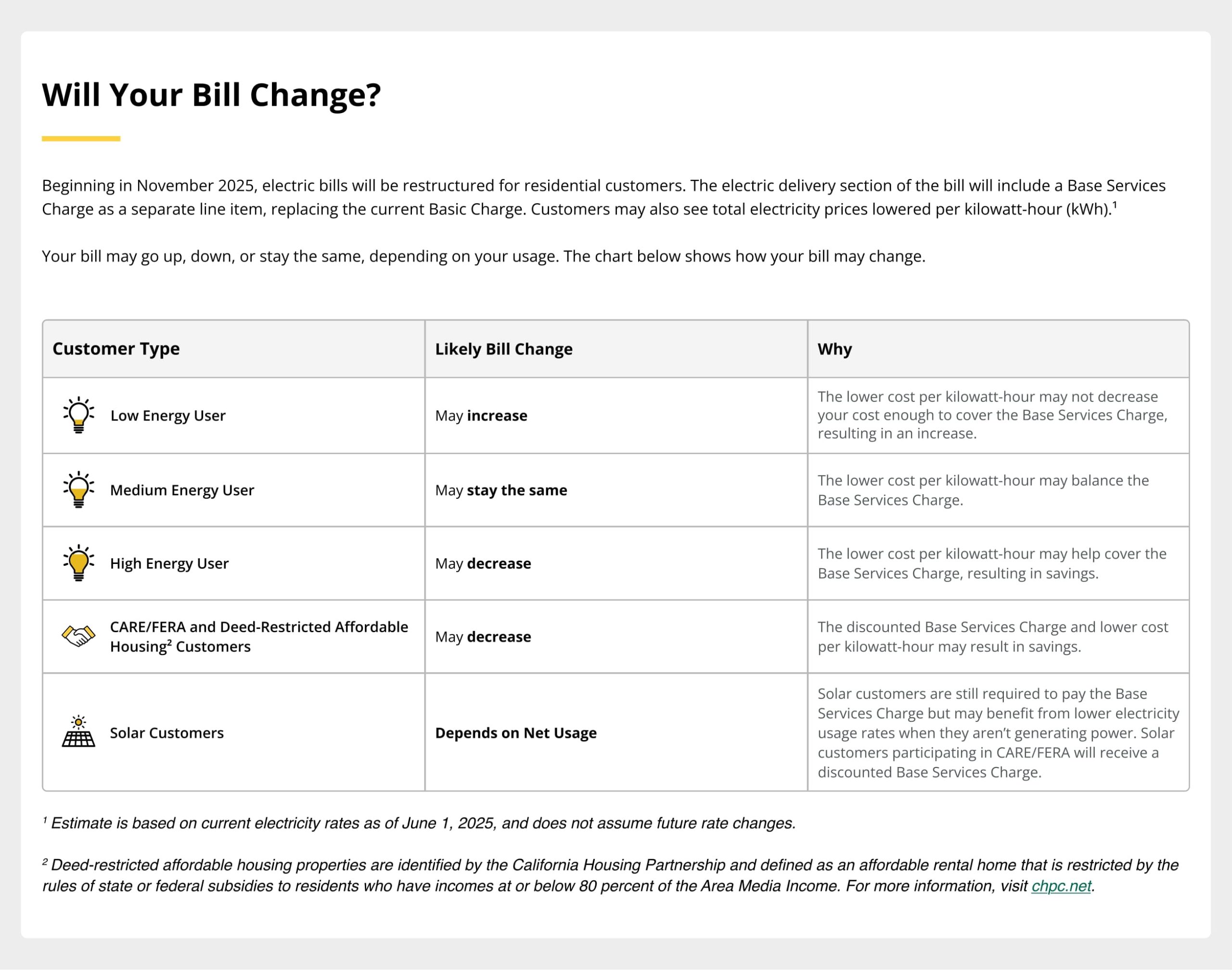 Visit sce.com/BaseServicesCharge to learn more about how SCE’s Base Services Charge will potentially affect your bill beginning in November 2025.